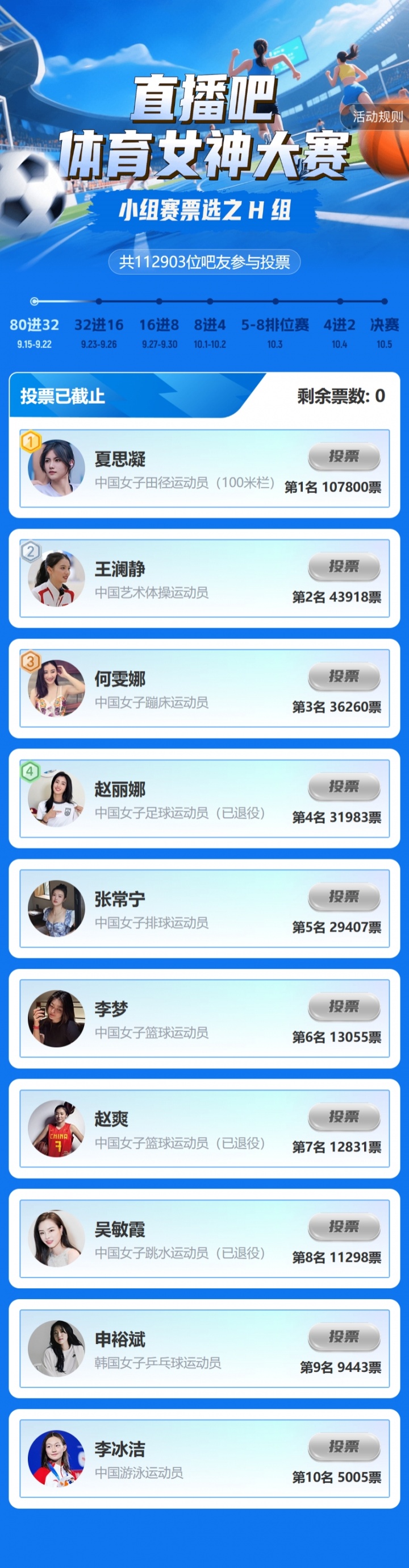 截至今日10:00,小組賽H組的投票已全部結束(點擊查看H組賽果),晉級32強的選手分別是: