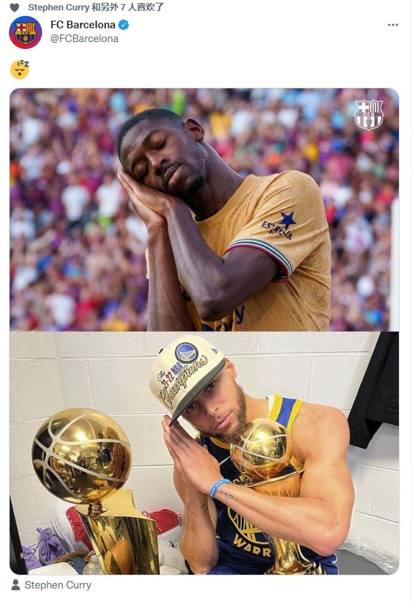 早在2022年7月底,當時還在巴薩的登貝萊就模仿著做過這個慶祝動作,庫里當時點贊并表示:“晚安是新的潮流!”