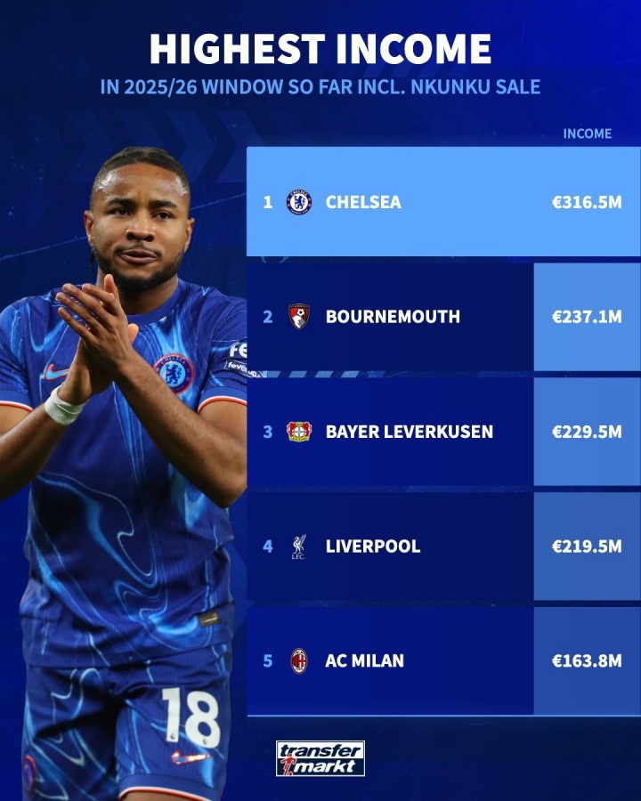 08月28日訊 據多家媒體消息,恩昆庫即將以超過4000萬歐元轉會費加盟米蘭,據德轉統計,切爾西今夏賣人總收入將達到3.165億歐元,冠絕全歐,比賣人榜第二位的伯恩茅斯多了近8000萬歐元。