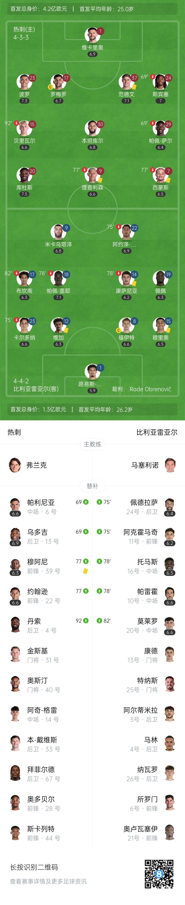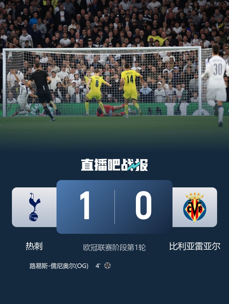 下半場傷停補(bǔ)時4分鐘,全場比賽結(jié)束,最終熱刺1-0比利亞雷亞爾。