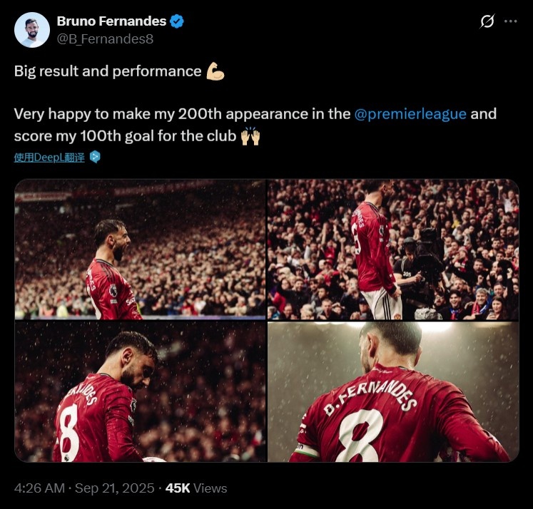 B費曬出自己的賽場照,并配文:重要的結果和表現!很高興達成個人英超200場和曼聯100球。