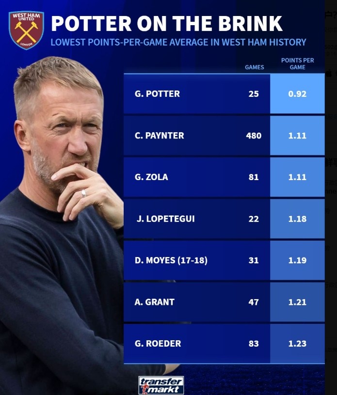 9月21日訊 英超第5輪比賽,西漢姆聯在主場以1-2的比分不敵水晶宮,格拉漢姆-波特遭遇下課危機。根據數據統計,波特是西漢姆聯隊史拿分率最低的主教練,場均僅能拿到0.92分。