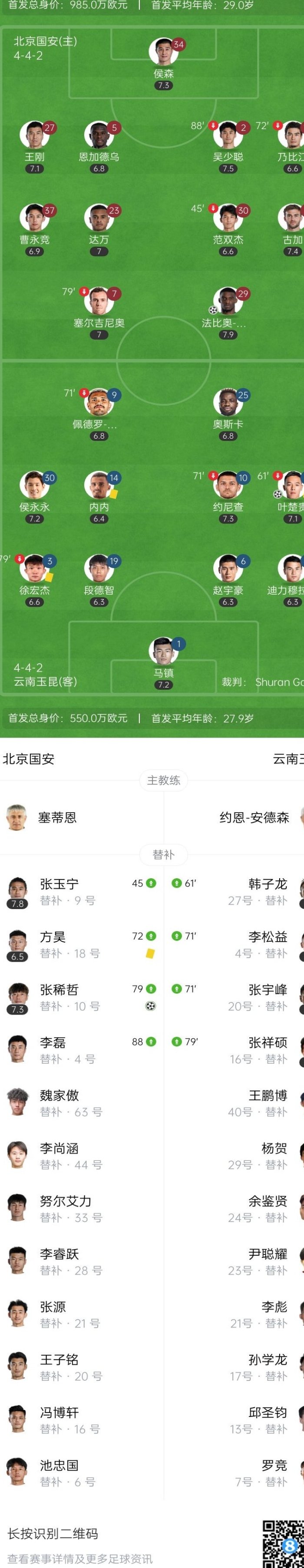 第30分鐘,云南玉昆右路攻勢,約尼查第一下傳中被擋回,隨后人群中將球一捅,葉楚貴點球點附近直接推射破門!云南玉昆客場1-0領先北京國安↓