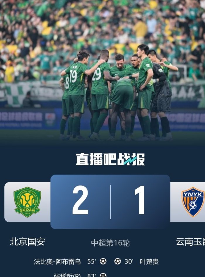 6月30日訊 北京時間19:35,中超第16輪北京國安vs云南玉昆,比賽在北京工人體育場打響!上半場,葉楚貴幫助客場作戰的云南玉昆取得領先!法比奧禁區倒地獲得點球,隨后被VAR取消!下半場,張玉寧頭球擺渡,阿布雷烏扳平比分!張玉寧隨后又制造點球!張稀哲主罰命中!